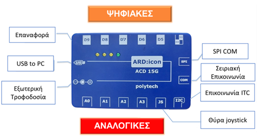 - 1 Ψηφιακή θύρα διπλού PIN: D3+D4 για συσκευές που απαιτούν 2 ψηφιακά σήματα ταυτόχρονα, π.χ. χρονισμό & δεδομένα (Sonar module με trigger και echo)